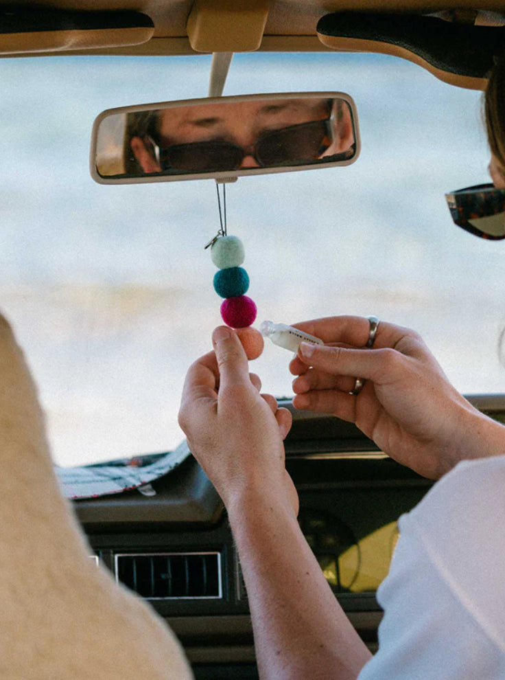 This set includes four unscented felt balls with a branded charm and elastic string, making them easy to hang in your car and a 5mL bottle of our sweet Honeysuckle fragrance oil. This captivating fragrance captures the essence of a sun-drenched summer day, combining a delightful blend of sweet, fruity, and warm floral notes accented by subtle hints of mandarin and pine needles.